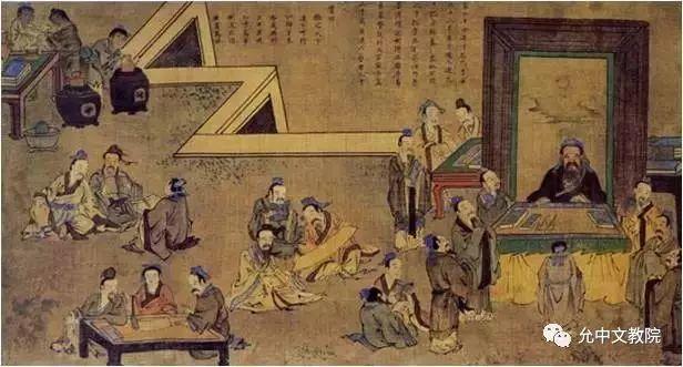 宋朝的《圣迹二十四图》,是描绘了孔子一生的二十四幅图,其中的一幅叫做《孔子授学图》,画的是孔子周游列国后回到鲁国,开门授徒讲课的场景: